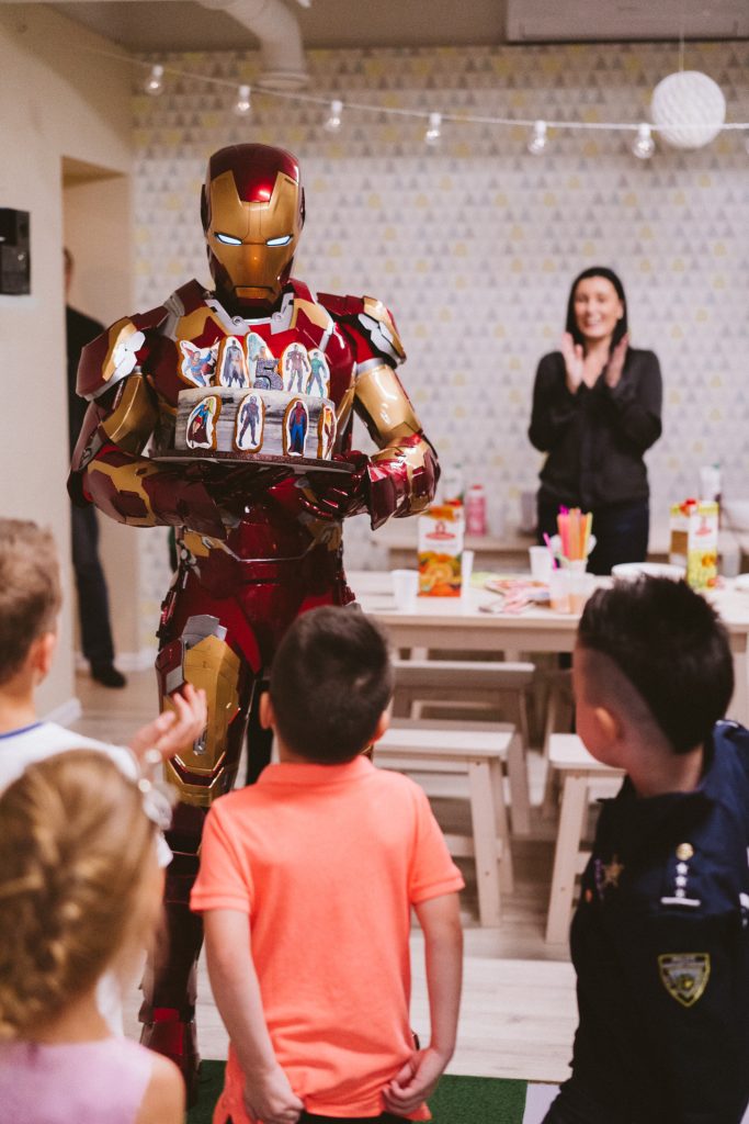** Помощник(Не аниматор) помогает надеть костюм железного человека в силу того, что костюм сложный. Помощник так же подает реквизит аниматору, включает музыку. Помогает снять костюм.